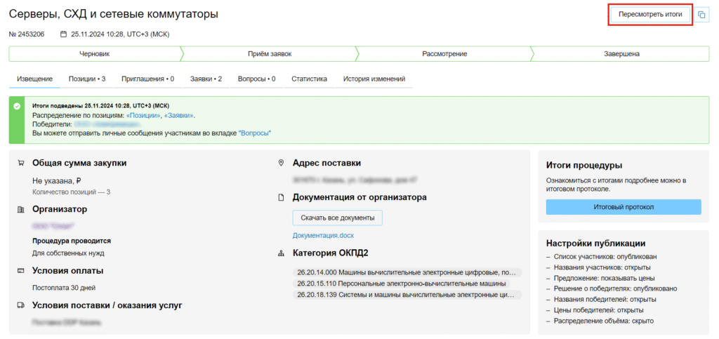 Важным преимуществом площадки остается отсутствие ограничений по срокам подведения итогов – как и раньше, организаторы могут адаптировать процесс с учетом всех этапов внутреннего согласования и выделять на принятие решений необходимое время. А для поставщиков в качестве ориентира можно указать плановую дату завершения в карточке процедуры.