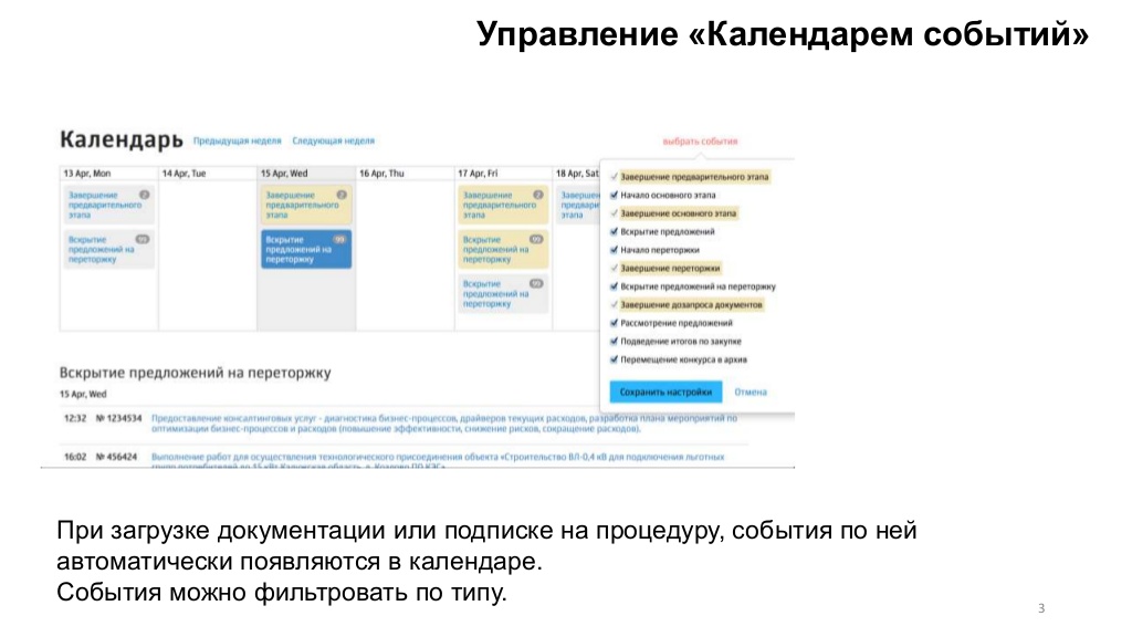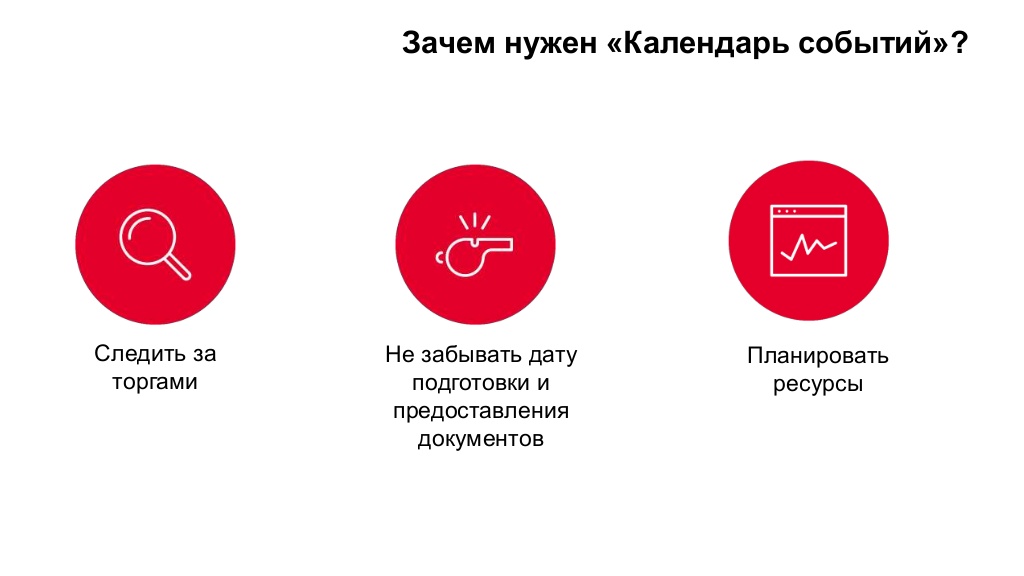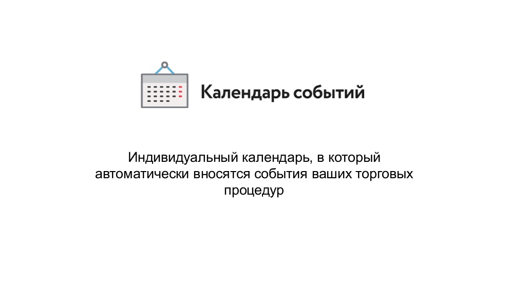 Приложение дает доступ к индивидуальному календарю, в который автоматически вносятся события торговых процедур, если вы скачиваете по ним документацию, делаете ставку или подписываетесь на обновления. С помощью него вы можете легко отслеживать события любого дня, грамотно планировать свои действия и не упускать ни одной важной даты.