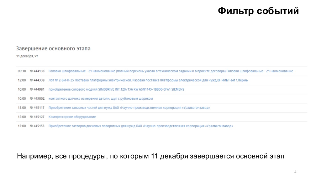 Приложение позволяет просматривать события на текущую дату, и также на любой другой день. При этом события одинакового типа (например, «Завершение основного этапа» или «Вскрытие предложений») объединяются в одну группу, чтобы более важные из них не потерялись в общей массе. Если пользователю неинтересны определенные этапы в ходе торгов, он может отключить их отображение.