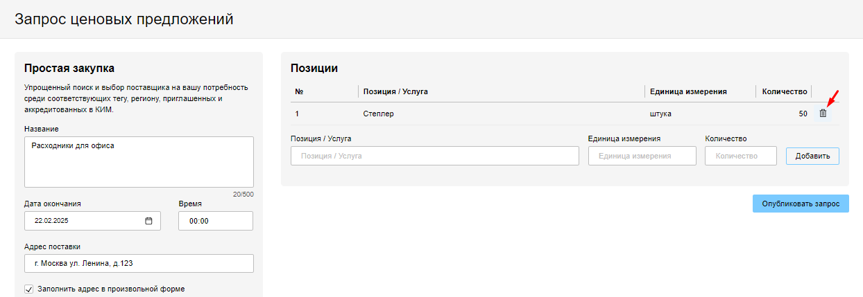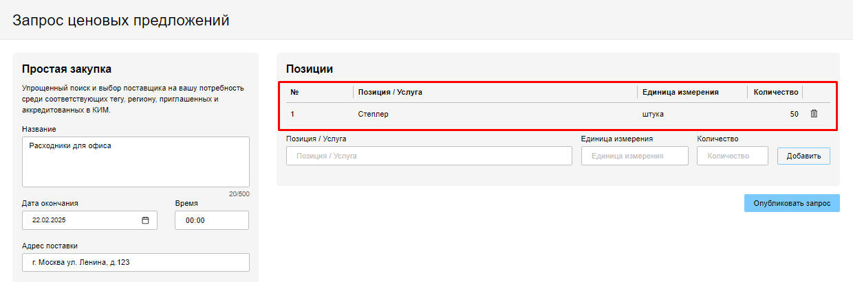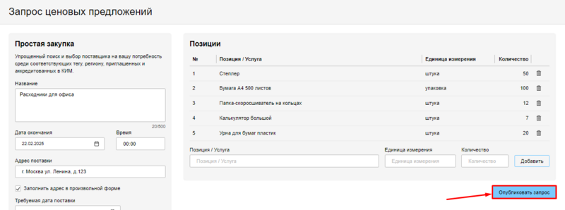 9. Добавив/загрузив необходимые позиции, нажмите кнопку Опубликовать запрос.