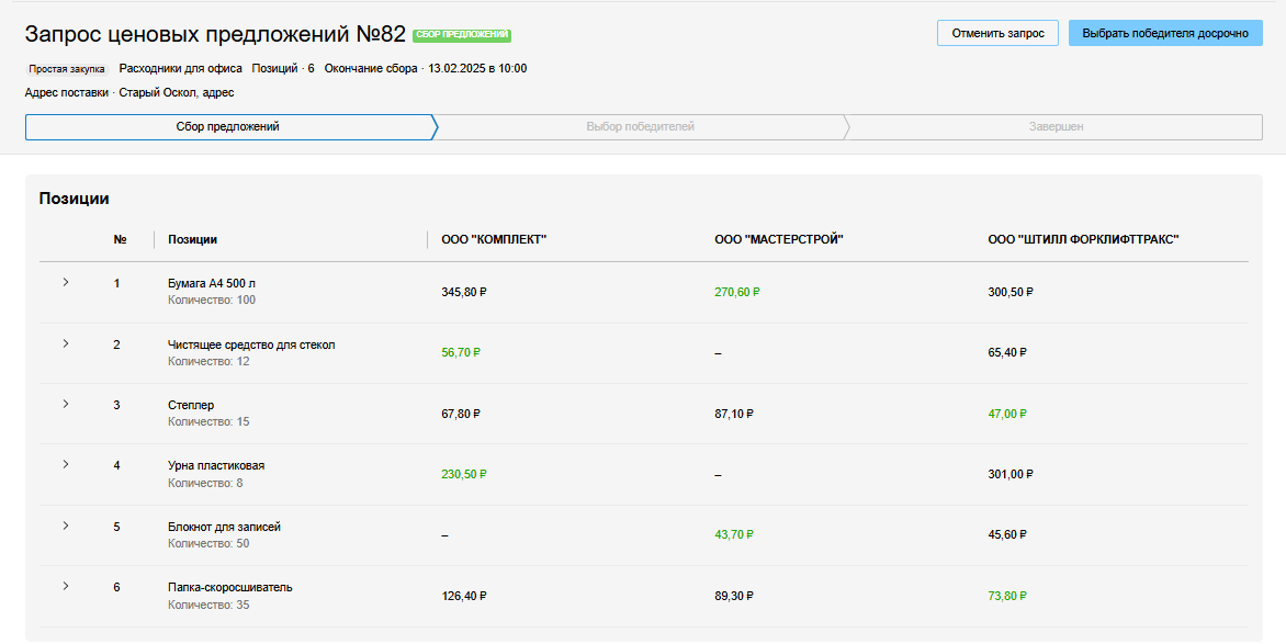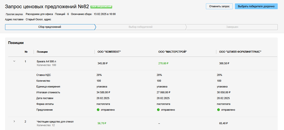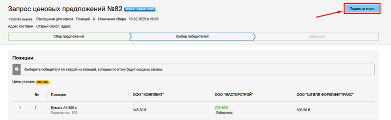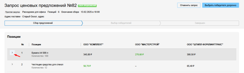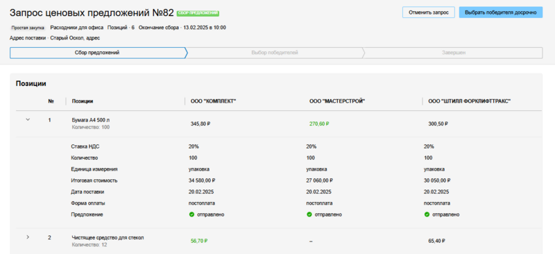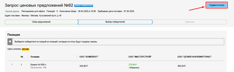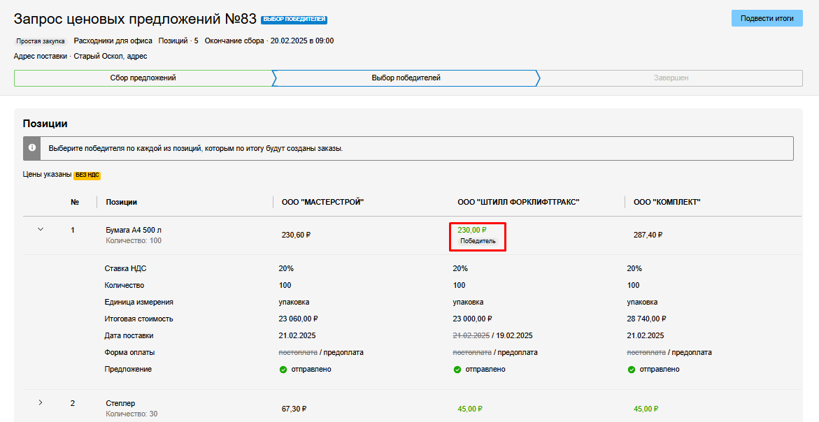 Запрос перейдет на этап Выбор победителей. Система по умолчанию выберет победителями по позициям поставщиков, предложивших минимальные цены. Они выделены тегом Победитель.
