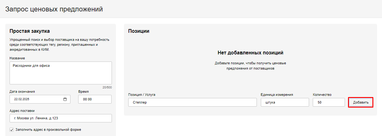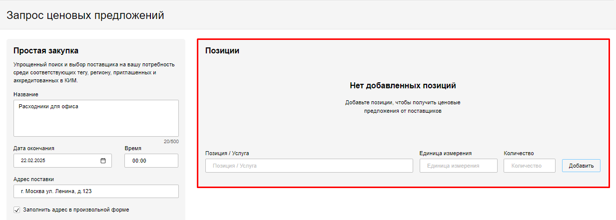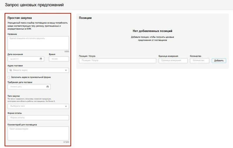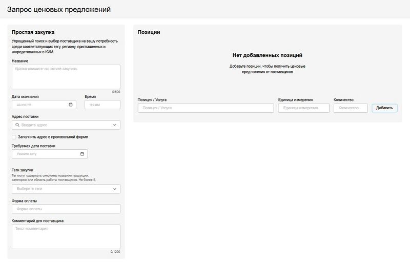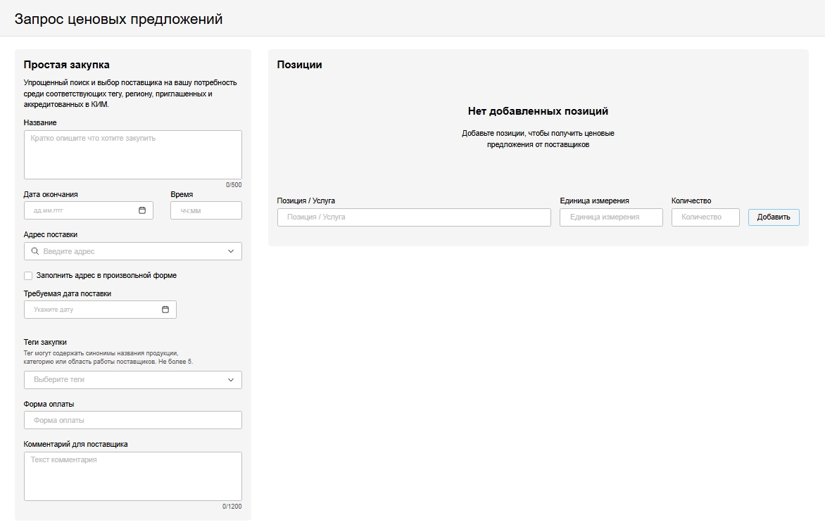 5. Откроется страница создания запроса ценовых предложений в рамках простой закупки.