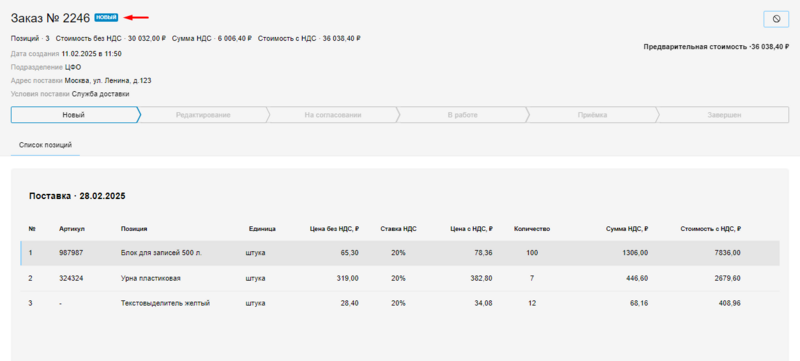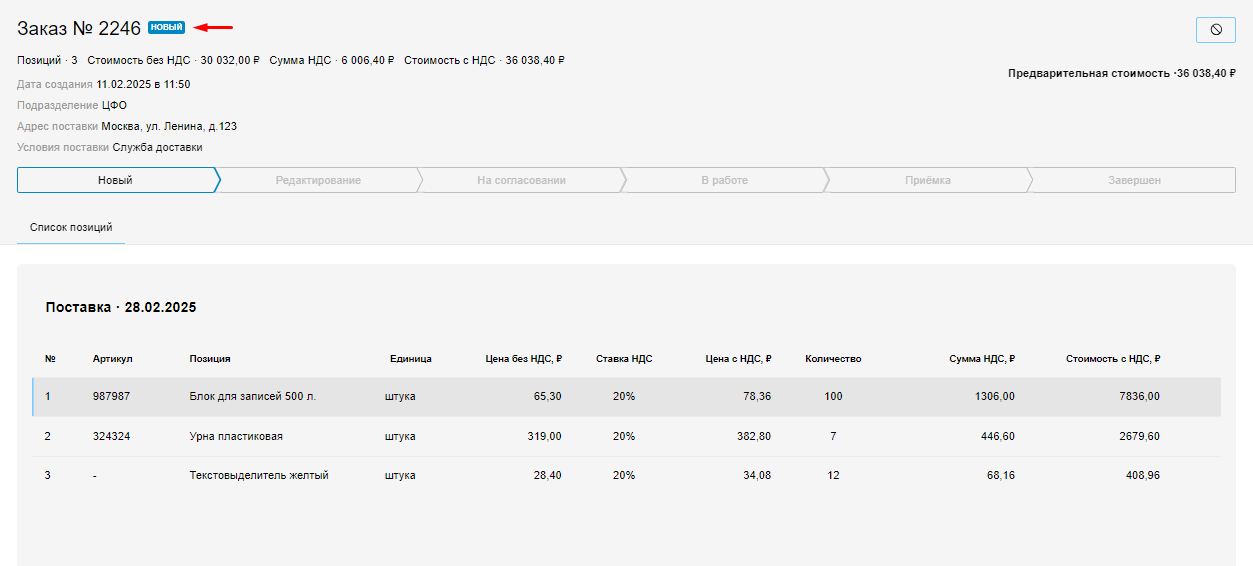 Позиции из файла отобразятся в интерфейсе Системы. Таким образом вы можете многократно загружать позиции в заказ. Они будут прибавляться к списку позиций, ранее загруженных или добавленных вручную.