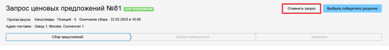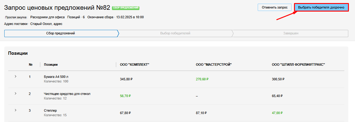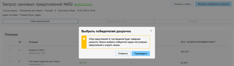 Вы имеете право досрочно завершить запрос, не дожидаясь даты, указанной при его создании. Для этого нажмите кнопку Выбрать победителя досрочно.