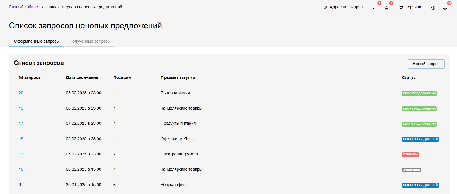 2. Отобразится страница со списком запросов ценовых предложений. По умолчанию активна вкладка Оформленные запросы.
