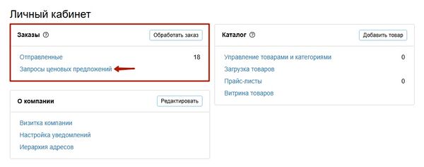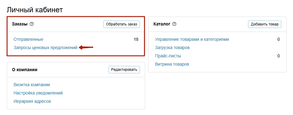 1. Чтобы создать простую закупку, перейдите в Личный кабинет Каталога, и в блоке Заказы нажмите на ссылку Запросы ценовых предложений.