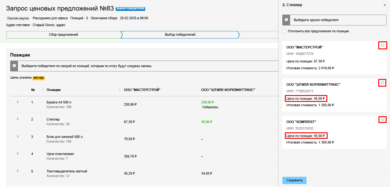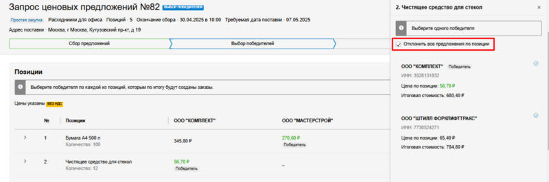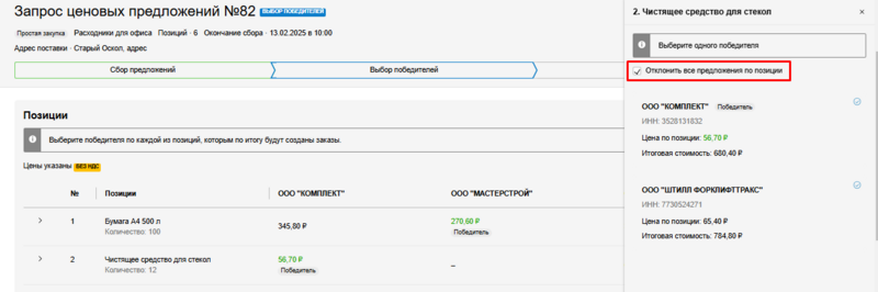 В случае, если несколько поставщиков предложили одинаковую цену по позиции, Система не выберет победителя автоматически — его необходимо будет выбрать вручную, установив отметку в блоке с наименованием предпочтительного поставщика.