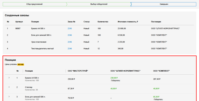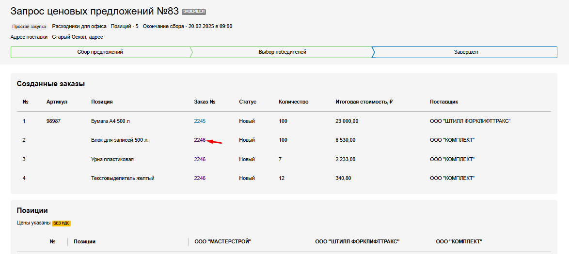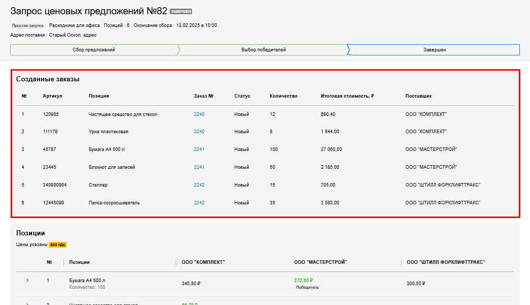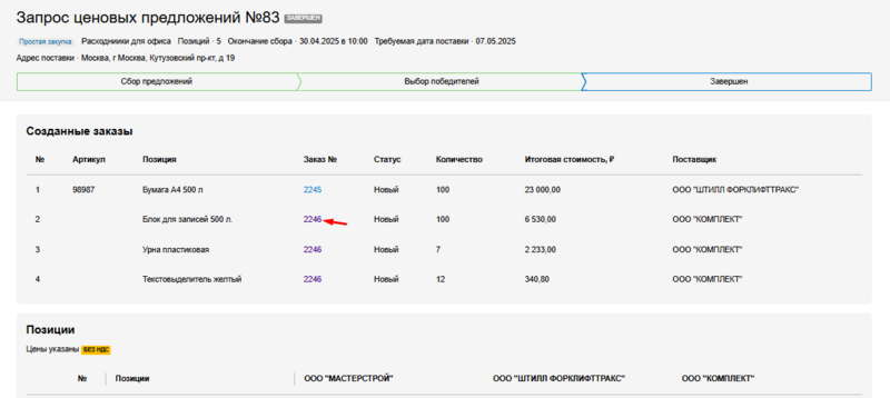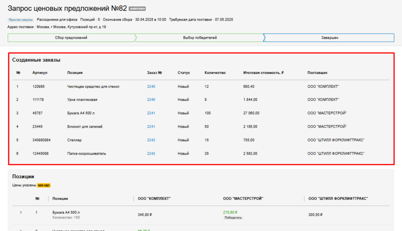 На странице запроса появится блок Созданные заказы — они автоматически создадутся для позиций, по которым был выбран победитель.