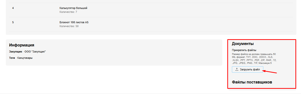 К запросу возможно прикрепить документы, с которыми необходимо будет ознакомиться поставщикам. Сделать это можно с помощью кнопки Загрузить файл в блоке Документы в правой нижней части страницы.