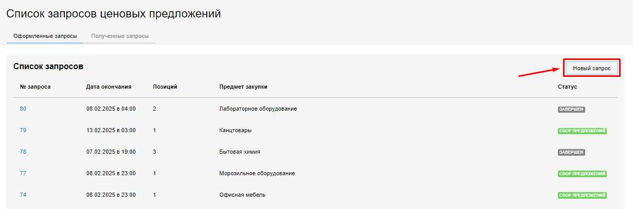 - Дата окончания — нажатие на заголовок столбца позволяет отсортировать запросы в списке по возрастанию/убыванию даты окончания сбора предложений;