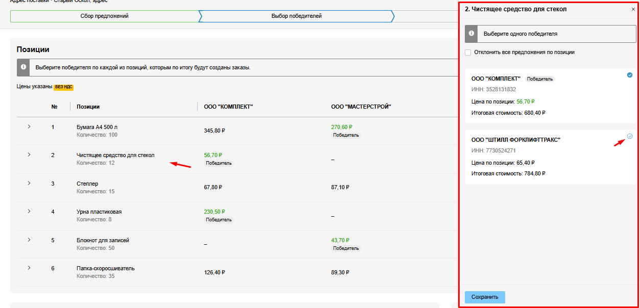 Нажмите на блок с наименованием поставщика, которого вы хотите выбрать победителем по позиции. В блоке будет проставлена отметка