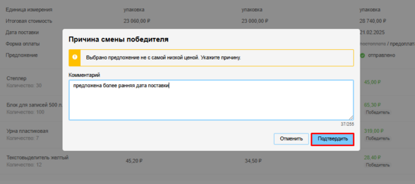 В отобразившемся окне укажите причину смены победителя и нажмите Подтвердить.