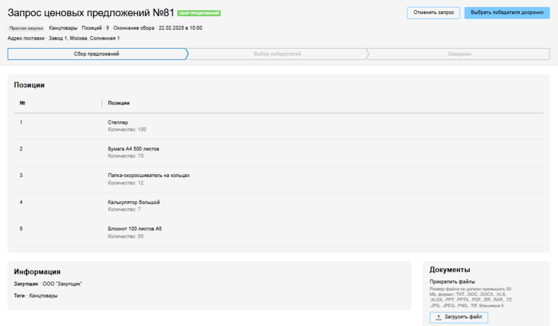 После того, как запрос ценовых предложений создан, начинается этап Сбор предложений, и запросу присваивается одноименный статус.