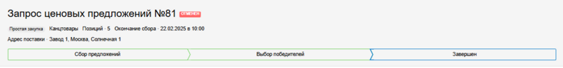 Если по запросу не было получено ни одного предложения от поставщиков, этап выбора победителей автоматически пропускается и запрос сразу получает статус Завершен. Вам будет направлено соответствующее уведомление.