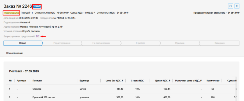 В Системе доступна функциональность Простая закупка — модуль позволяет в упрощенной форме создавать запросы ценовых предложений и таким образом закупать необходимые товары/услуги на рыночных условиях без необходимости проводить полноценную процедуру торгов.