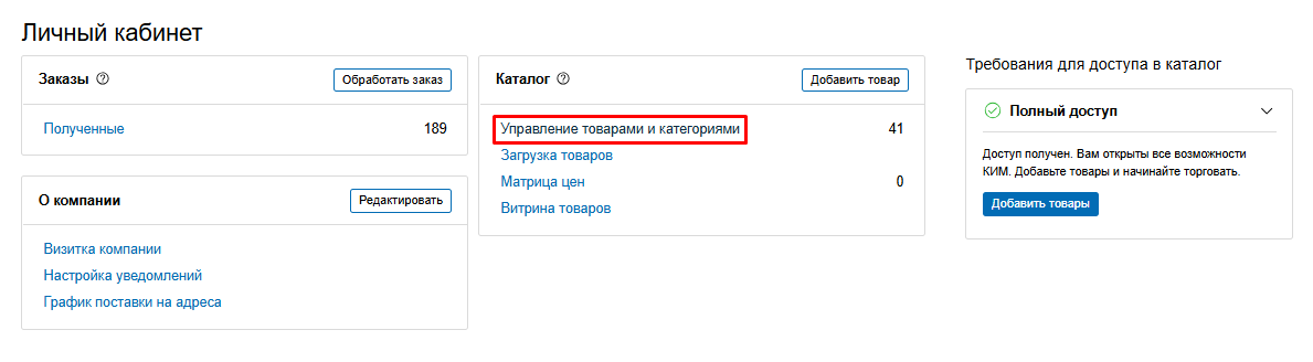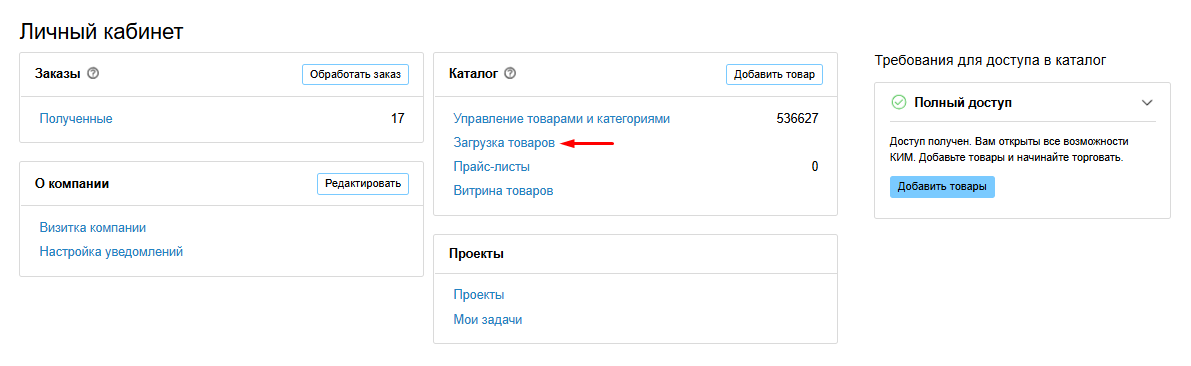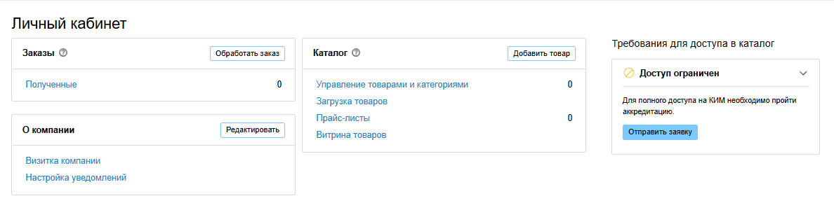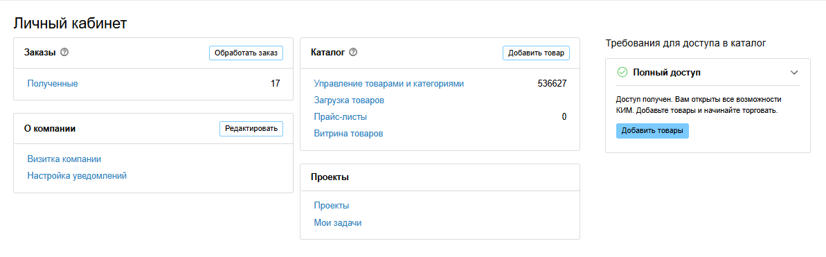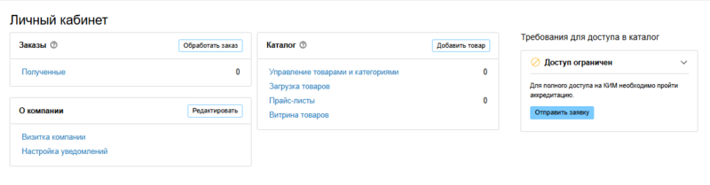 На странице представлены блоки разделов, в которых поставщик видит поступившие заказы, может загружать свой каталог с прайс-листом и управлять товарами: