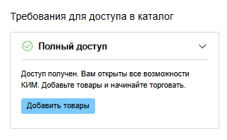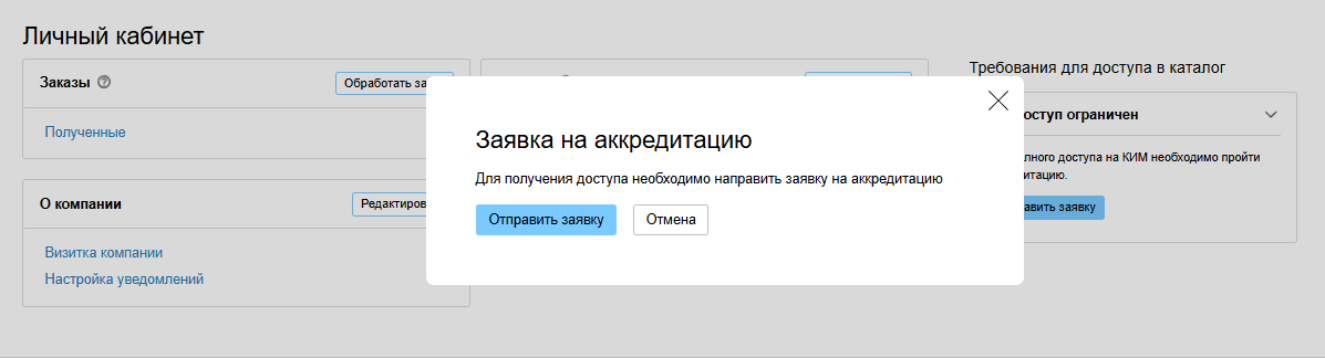 Ожидайте получения аккредитации. После того, как Оператор Системы аккредитует вас, в правой части страницы в блоке Требования для доступа в каталог будет отображаться уведомление: