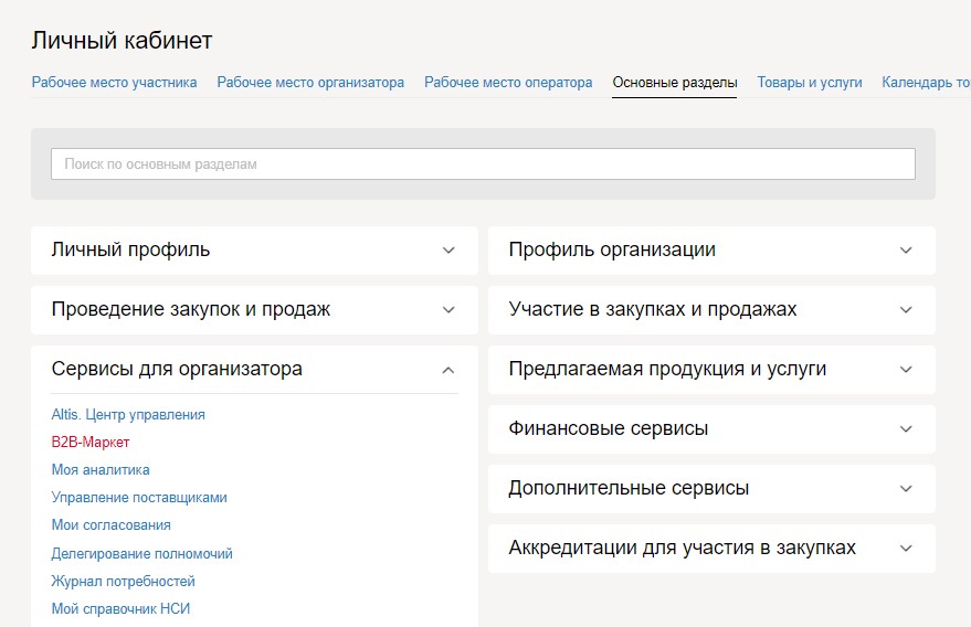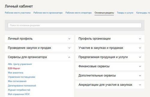2. Из Личного кабинета площадки B2B-Center: Личный кабинет - вкладка Основные разделы - раздел Сервисы для организатора - B2B Маркет: