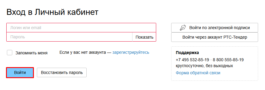 1.1. Если ранее Ваша организация уже работала на площадке B2B-Center, дополнительная регистрация для работы в B2B Маркет не потребуется. Заполните поля формы Вход в Личный кабинет и нажмите кнопку Войти: