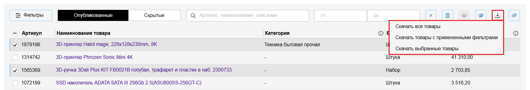 Чтобы скачать товары из каталога, выберите один или несколько товаров, установив отметку в нужной строке (строках) и нажмите кнопку Скачать товары.
