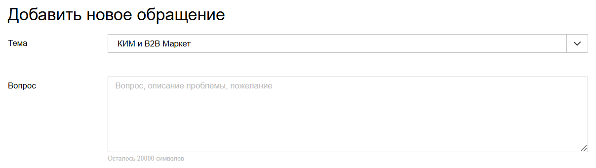 2. На отобразившейся странице в блоке Добавить новое обращение выберите тему обращения "КИМ и B2B Маркет" и сформулируйте сам вопрос, опишите проблему или пожелание: