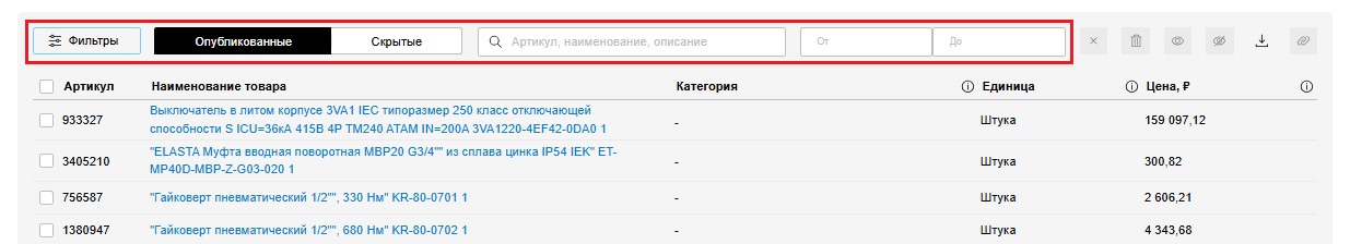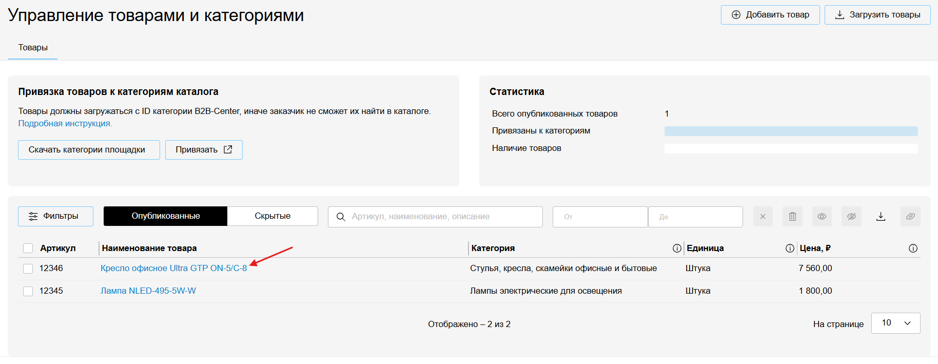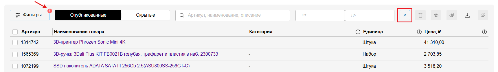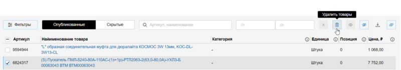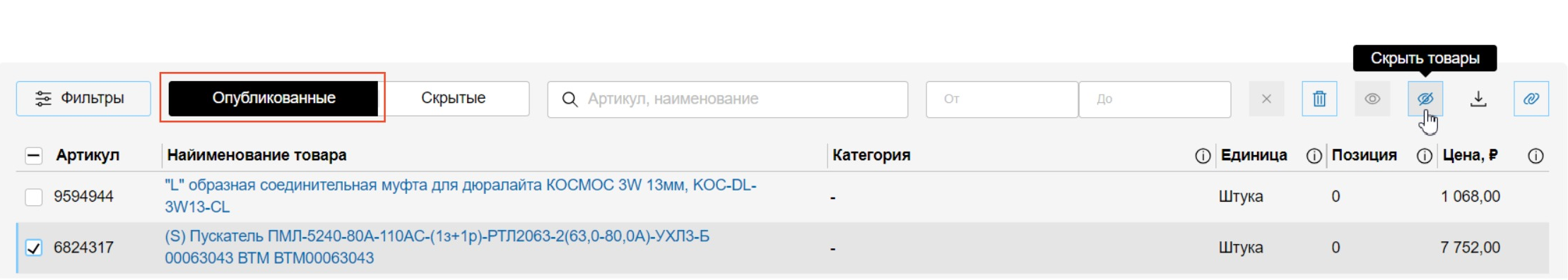 На странице также доступны вкладки Опубликованные и Скрытые - они позволяют отображать, соответственно, только опубликованные или только скрытые товары: