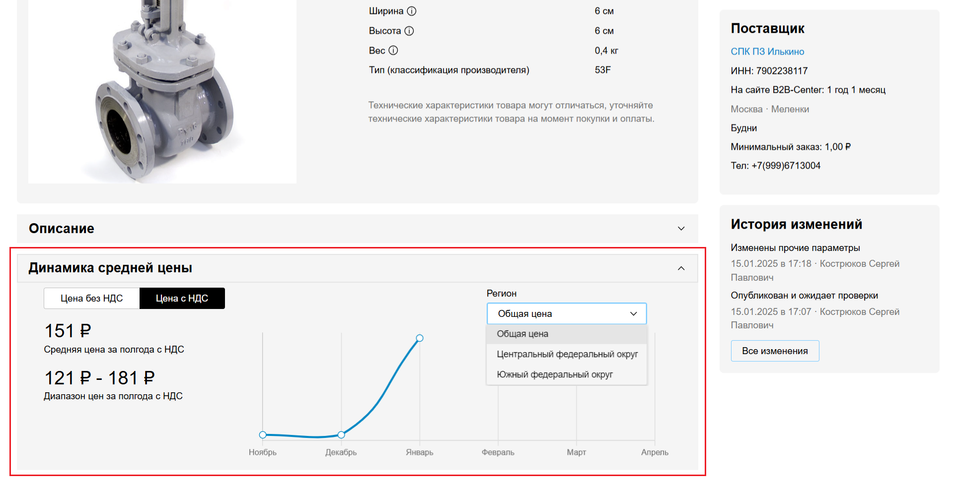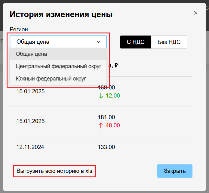 Отобразится всплывающее окно с информацией о цене. При необходимости вы можете посмотреть историю изменения цены для конкретного региона либо выгрузить всю историю в формате xls: