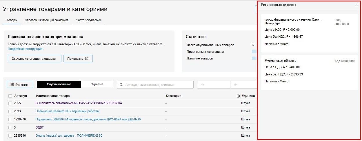 Если товар был загружен в каталог с указанием региональных цен, то в его карточке будет отображаться диапазон цен и ссылка N региональных цен, при нажатии на которую открывается боковое меню с детализацией цен и регионов:
