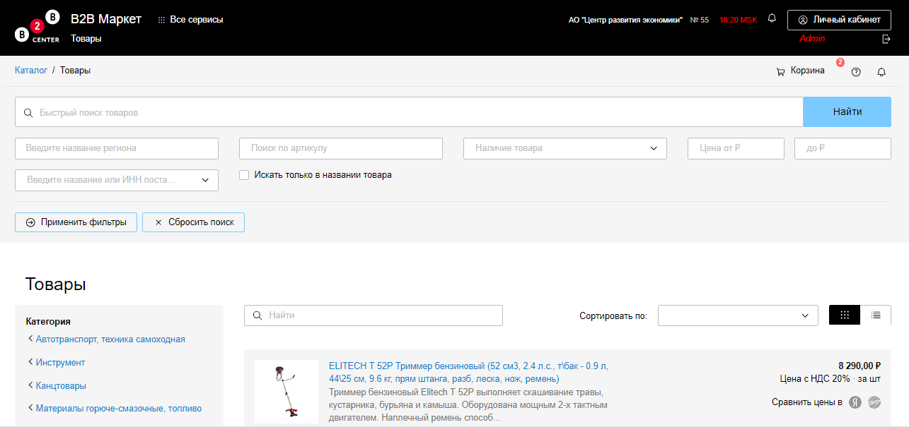 B2B Маркет - электронная площадка с общим публичным каталогом товаров проверенных поставщиков, созданная для быстрых покупок допущенных заказчиков и расположенная по адресу https://market.b2b-center.ru |