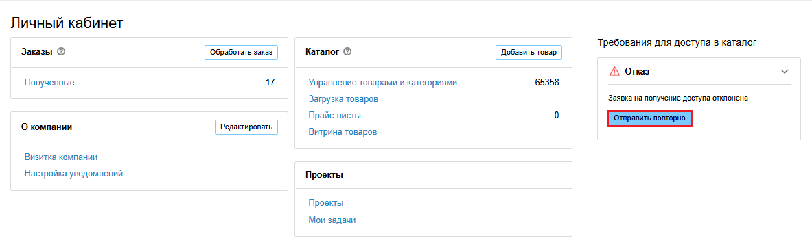В случае отказа в аккредитации вы можете направить обращение через раздел Помощь для уточнения причин отказа. Кроме того, в случае отказа заявку на доступ к B2B Маркет можно отправить повторно. Для этого воспользуйтесь одноименной кнопкой: