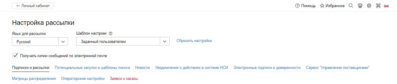 Изменить настройки уведомлений можно в разделе Личного кабинета системы B2B-Center (Основные разделы > Личный профиль > Подписки и рассылки > Заявки и заказы).