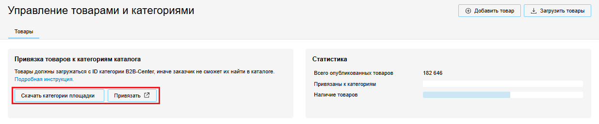 Меню управляющих элементов в блоке со списком товаров каталога также включает кнопку Привязать товары, воспользовавшись которой вы можете привязать товары к категориям B2B-Center.