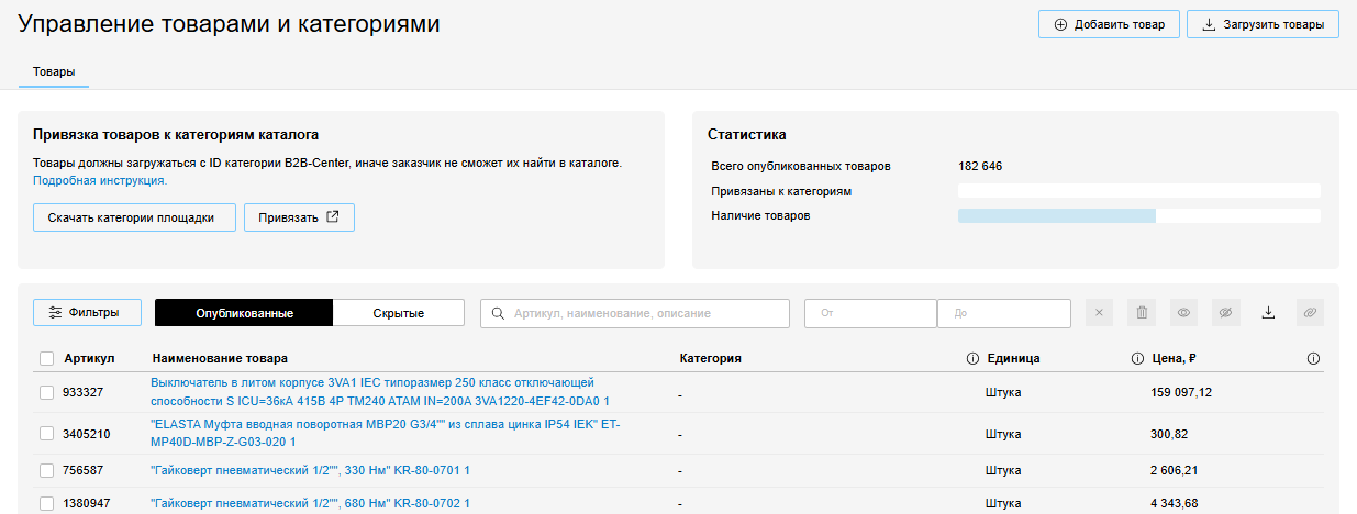 - по категориям B2B-Center (в списке доступны для выбора только такие категории, к которым привязан хотя бы один товар).