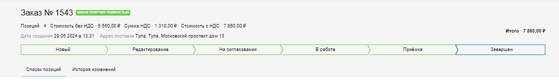 3.2. Как только закупщик подтвердит получение товаров (осуществит приемку в Системе), заказу будет присвоен статус Завершен: