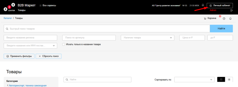Чтобы перейти в Личный кабинет портала B2B Маркет, нажмите кнопку Личный кабинет в правом верхнем углу главной страницы: