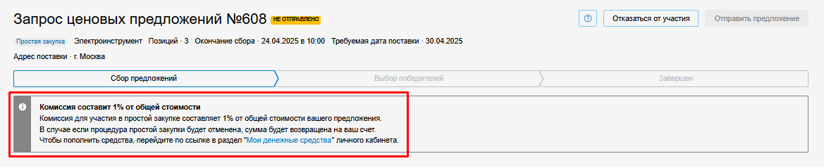 На странице запроса ценовых предложений, проводимого в рамках простой закупки, будет отображаться системное сообщение о порядке взимания комиссии.