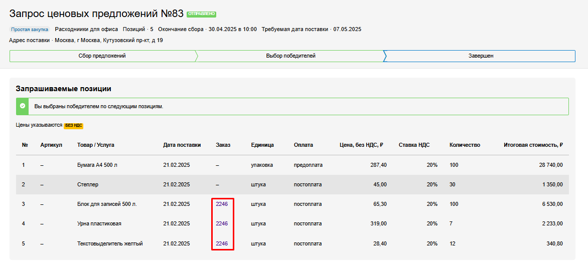 Если поставщик выбран победителем, то в списке позиций помимо стандартных полей отображается номер созданного заказа. Чтобы перейти к заказу, нажмите на ссылку с номером.