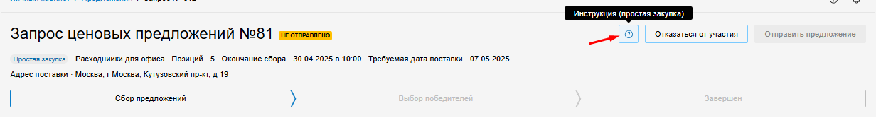В верхней части страницы отображается краткая информация о простой закупке: предмет закупки, дата и время окончания сбора предложений (по МСК), требуемая дата и адрес поставки.