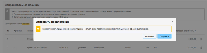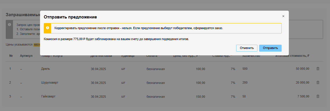 После того, как вы заполните поля формы подачи предложения по запрашиваемым позициям и нажмете кнопку Отправить предложение, отобразится форма подтверждения — в ней будет указана сумма комиссии, рассчитанная от суммы значений в столбце Итоговая стоимость, ₽.