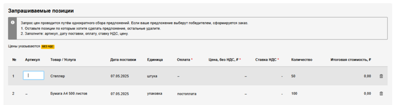 8. Если вы решили отправить предложение закупщику, то для позиций, которые вы готовы поставить, заполните поля Артикул, Цена без НДС, ₽ и Ставка НДС. Обязательные для заполнения поля отмечены звездочкой.