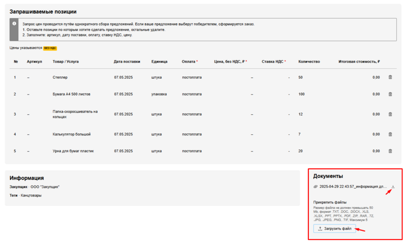 5. Если закупщик прикрепил файлы, с которыми необходимо ознакомиться поставщикам, скачайте их в блоке Файлы закупщика. При необходимости прикрепите в этот бок свои файлы с помощью кнопки Загрузить файл.