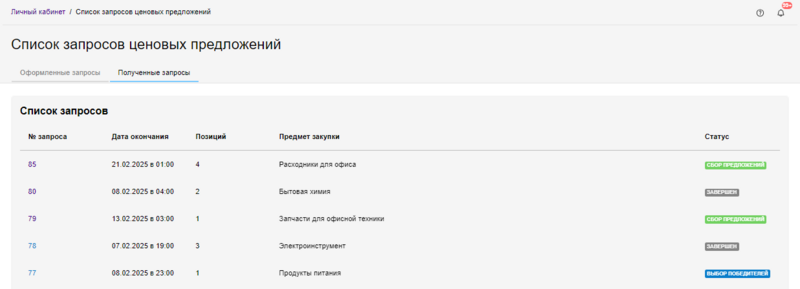 2.1. Отобразится страница со списком запросов ценовых предложений. По умолчанию активна вкладка Оформленные запросы. Перейдите на вкладку Полученные запросы.
