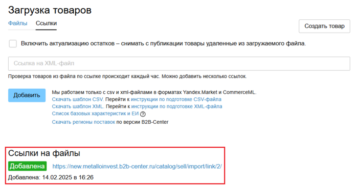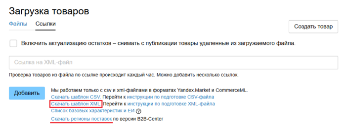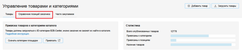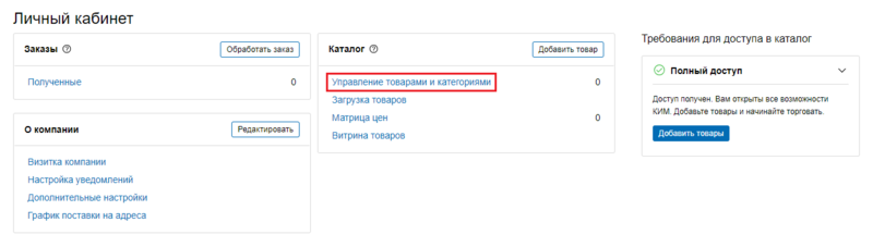 Чтобы перейти в единый интерфейс управения товарами, в блоке Каталог товаров и услуг Личного кабинета нажмите на ссылку Размещение каталога товаров: