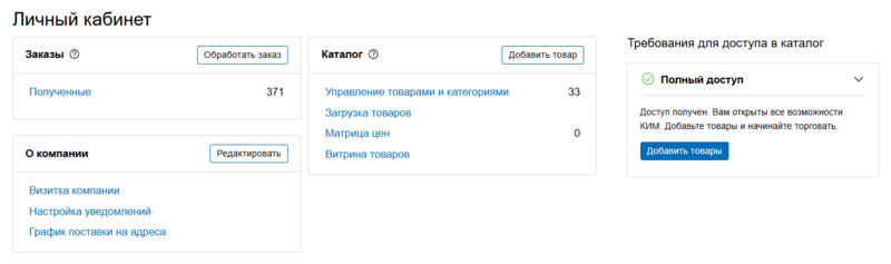 На странице Личный кабинет отображаются разделы, в которых вы можете просмотреть заказы, поступившие от заявителей заказчика, увидеть статус своей аккредитации у заказчика, загружать свои товары в каталог, управлять товарами: