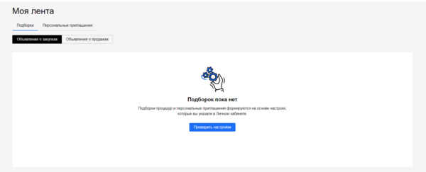 1.1. Во вкладку Подборки попадают актуальные торговые процедуры, которые автоматически подобраны нашей рекомендательной системой, а также в соответствии с вашими шаблонами поиска, категориями классификатора и регионами. Настроить эти параметры можно в личном кабинете в разделе Подписки и рассылки (вкладка ).