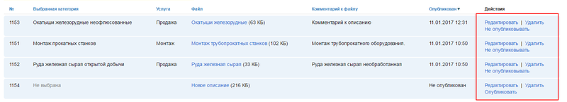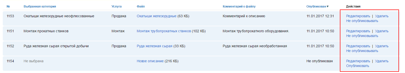 1. Чтобы Опубликовать в карточке организации добавленный файл с описанием продукции/услуг, нажмите одноименную ссылку в графе Действия таблицы описаний.