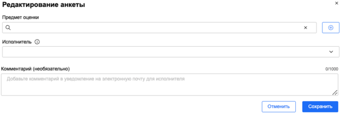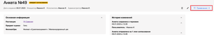 В Системе предусмотрена возможность вести переписку (оставлять комментарии, документы, пояснения) в рамках одной анкеты оценки посредством примечаний.
