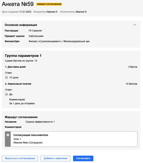 Чтобы согласовать анкету для оценки поставщика, выполните следующие действия: