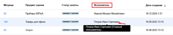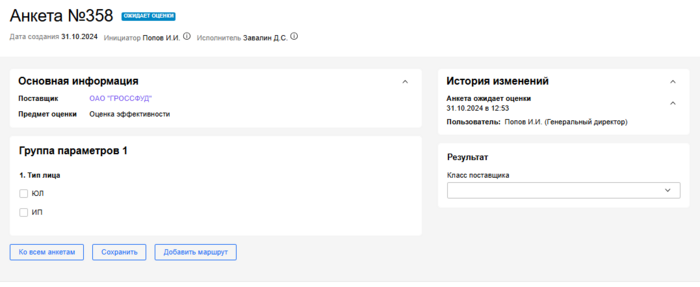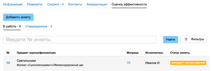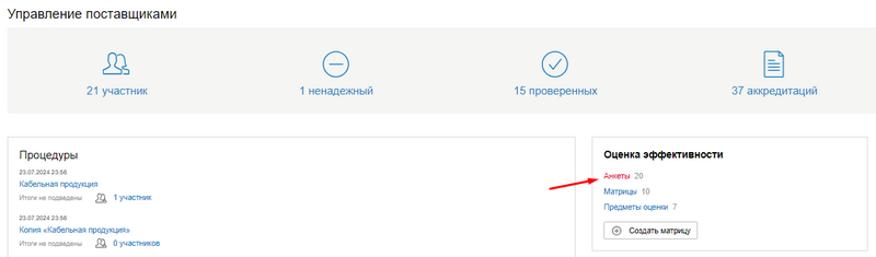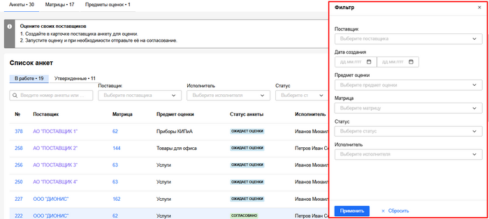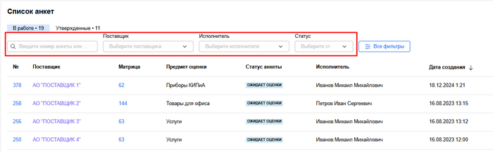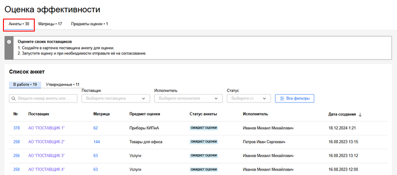 5. Откроется список всех анкет для оценки выбранного поставщика.