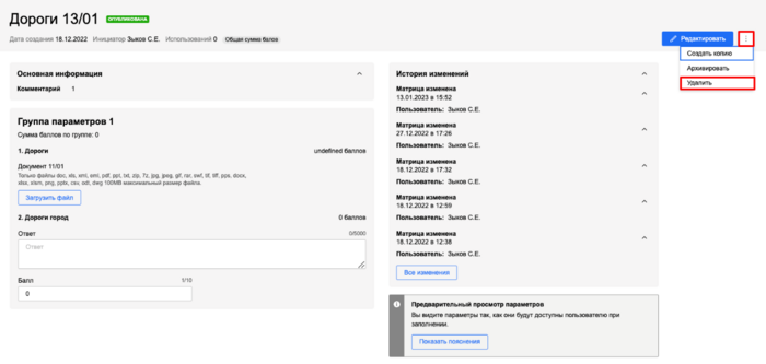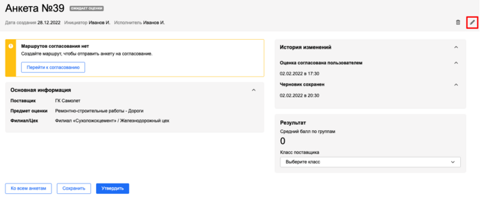 Чтобы редактировать анкету для оценки поставщика, выполните следующие действия: